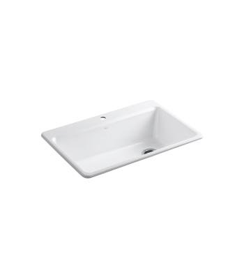 KOHLER K-5871-1A2-0 Riverby Single Bowl Top-Mount Kitchen Sink, White . Product Features:Single basin design provides maximum available workspaceCovered under Kohler s limited lifetime warrantyThe understated beauty of this Riverby sink makes it an elegant and versatile addition to any kitchenThe large basin provides ample space to soak and wash cookware, while a sloped base to a single offset drain minimizes water poolingConstructed of enameled cast-iron which combines strength, durability and insulation benefitsTop mount installation makes for a quick and easy install wile keeping the elegant you craveOffset drain location increases workspace area in the sink as well as storage area underneathAll hardware needed for installation includedProduct Technologies / Benefits:Enameled Cast-Iron: Kohler Enameled Cast-Iron combines the strength, durability, and insulation benefits of cast-iron with the scratch, chip, and burn resistance of a baked, powder coat finish and comes with an exceptional Lifetime Limited Warranty. When these materials are combined it gives the sink or tub the strength to last a lifetime of use. Kohler Enameled Cast-Iron is also available in a wide variety of specialty colors allowing you to truly customize your home.Product Specifications:Height: 9-5/8" (measured from the bottom of the sink to the top most point of the sink)Overall Width: 22" (measured from the back outer rim to the front outer rim)Overall Length: 33" (measured from the left outer rim to the right outer rim)Basin Width: 17-1/4" (measured from the back inner rim to the front inner rim)Basin Length: 30-1/4" (measured from the left inner rim to the right inner rim)Basin Depth: 9" (measured from center of the basin to the rim)Installation Type: Top mountNumber of Faucet Holes: 1Drain Outlet Connection: 3-7