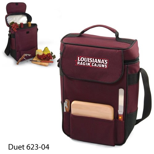 Louisiana University Lafayette Duet (8 Pack) . Insulated wine and cheese tote with 2 compartments for wine, made of 600D polyester canvas. The elegant and unique Duet wine and cheese tote is perfect for picnics, concerts, or travel. This tote has two compartments for wine bottles and a storage section to carry the amenities included: hardwood cutting board, water style corkscrew, and cheese knife. The adjustable shoulder strap makes it easy to carry. Convenient and practical, the Duet is perfect for wine and cheese lovers. A wonderful gift idea! Includes: 1 Corkscrew (waiter style stainless steel), 1 Cutting board (wood 6 x 6 in.), 1 Cheese knife (stainless steel w/wood handle). Color: Burgundy. Decoration: Embroidery.