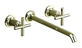 | ✚✚✚ KOHLER K-T14417-3-AF Purist Two-Handle Wall-Mount Lavatory Faucet Trim with 10-1/4" Spout and Cross Handles, Less Drain, Valve Not Included, Vibrant French Gold Finish/Color:Vibrant French Gold, Spout:10-1/4' - 35 Degree Spout, Handle:Cross Handles Serene and soothing, the Purist line of faucets is a calming force in any modern bath or powder room. Featuring washerless ceramic valving and offered in an array of stain- and corrosion-resistant Vibrant PVD color finishes, this Purist two-handle wall-mount faucet trim with 6' spout and lever handles ensures reliable performance and promises an inviting visual appeal. KOHLER ceramic disc valves exceed industry longevity standards two times for a lifetime of durable performance. Solid brass construction for durability and reliability. KOHLER finishes resist corrosion and tarnishing, exceeding industry durability standards two times. Fluid lines for ease of cleaning. Coordinates with Purist Suite of products. Cross or lever handles. Stationary spout. Less drain. Trim only. Available with a 6' (15.2 cm), 9' (22.9 cm), or 12'(30.5 cm) 90 spout from wall to center of drain or 6-1/4' (15.9 cm), 8-1/4' (21 cm), or 10-1/4' (26 cm) 35 spout from wall to center