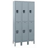 | ✚✚✚ HALLOWELL Maintenance-Free Quiet Lockers - Gray HALLOWELL Maintenance-Free Quiet Lockers feature sound-absorbing rubber door bumpers placing them among the most quiet lockers on the market today.14-gauge steel door; 16-gauge steel door frame; 24-gauge steel body. Full-height door panel is welded to the continuous piano hinge side and includes a 3" wide door stiffener. One-piece stainless steel recessed handle with finger tip pull: 1-tier has 3-point lock; 2- and 3-tier have 2-point lock. Accepts padlocks, mounted combination locks, and keyed locks. Include 6"H legs. 1- and 2-tier lockers have a double ceiling hook and (3) single wall hooks. 1-tier locker also has an upper shelf. Number plates are included. Specify number at time of order, otherwise will start with 1. Unassembled and set-up.NOTE: Set-up lockers are non-returnable.