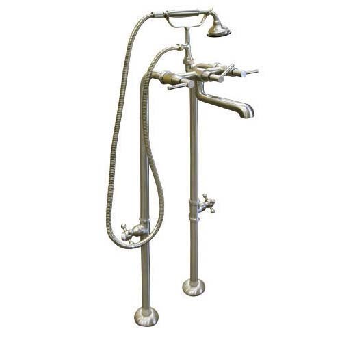 37-1/2" Contemporary Freestanding Tub Faucet with Shutoff Valves - Lever Handles - Chrome?This freestanding tub faucet features cylindrical lever handles and a sleek metal hand shower. Stands on straight riser tubes with shut-off valves. Solid brass construction. Available in three water line heights: 31-1/2 , 34-1/2 , and 37-1/2 H to fit any tub. 4 of total height is under floor. Completely freestanding; requires no supports except under floor. Heavy duty, 3/4 ID / 1 OD brass pipe. Four-ball, quarter turn cross handle shutoff valves with HOT and COLD porcelain buttons. Overall faucet dimensions: 12 W x 9-1/2 D x 13-3/4 H. Hand shower diverter valve. Included faucet has metal lever handles and lever diverter, hand shower with slimline cradle and flexible 5' hose. Faucet has 7 centers and 1/4 turn ceramic disc cartridges. Exclusive to Signature Hardware. Shown in Brushed Nickel.